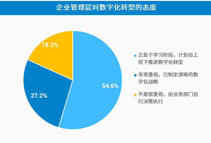 µ÷ÑÐÏÔʾ£¬£¬£¬£¬£¬£¬54.6%µÄÆóÒµÖÎÀí²ãÕý´¦ÓÚѧϰ½×¶Î£¬£¬£¬£¬£¬£¬ÍýÏë×ÔÉ϶øÏÂÍÆ½øÊý×Ö»¯×ªÐÍ£¬£¬£¬£¬£¬£¬ 27.2%µÄÆóÒµÖÎÀí²ã¶ÔÊý×Ö»¯×ªÐͺÜÊÇÖØÊÓ£¬£¬£¬£¬£¬£¬²¢ÒÑÖÆ¶©ÇåÎúµÄÊý×Ö»¯Õ½ÂÔ£¬£¬£¬£¬£¬£¬½öÓÐ18.2%µÄÆóÒµÖÎÀí²ã¶ÔÊý×Ö»¯×ªÐͲ»ÊǺÜÖØÊÓ£¬£¬£¬£¬£¬£¬¶øÓÉÓªÒµ²¿·Ö×ÔÐоöÒéÖ´ÐС£¡£¡£¡£¡£