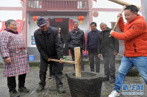 江西省井冈山市茅坪乡神山村村民在打糍粑(1月15日摄)。。。。。。。。 新华社记者 彭昭之 摄